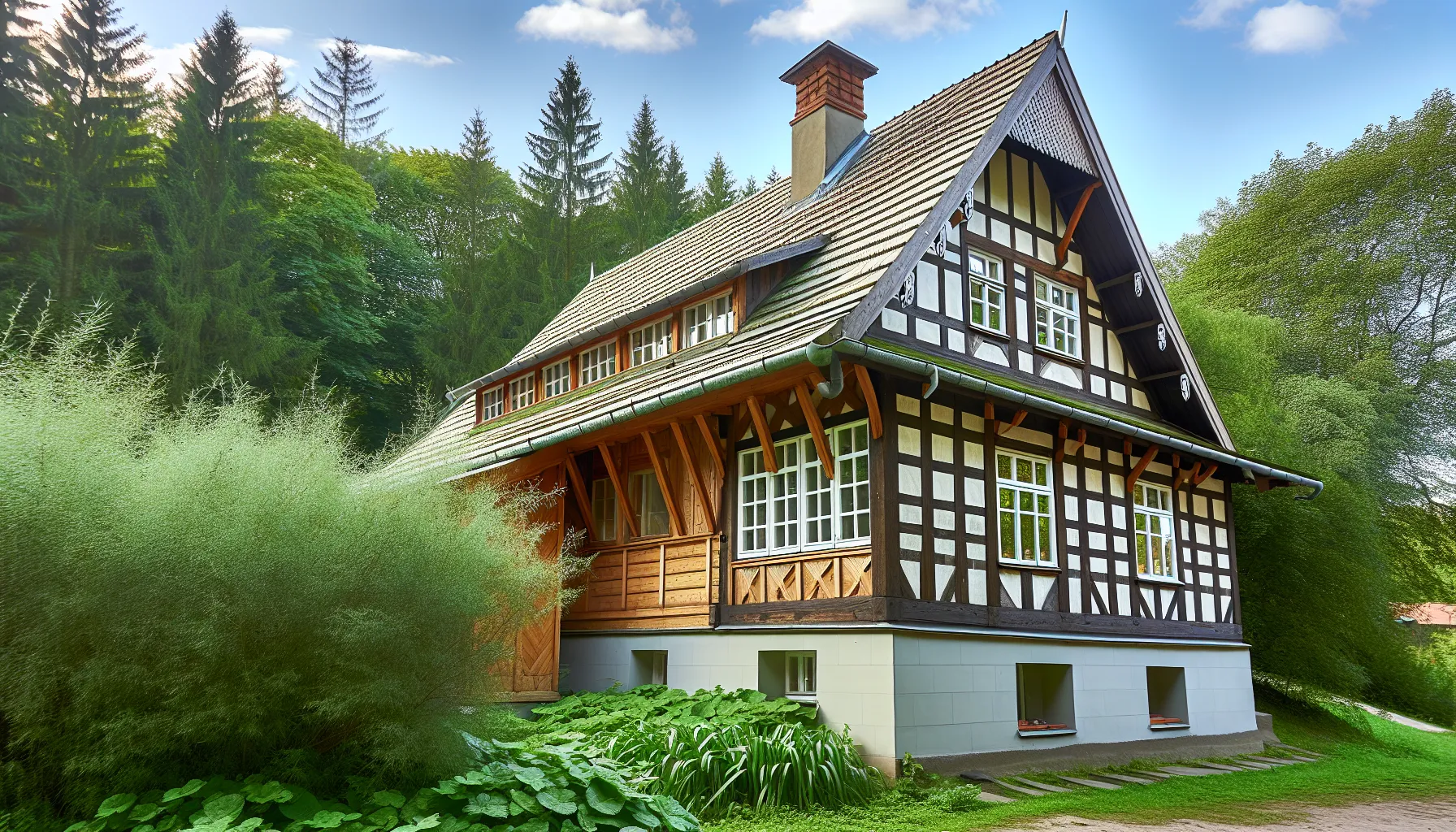 Let’s start with traditional timber frame homes. Living in a half-timbered house aligns with eco-friendly practices, as these homes use high-quality, biologically sound materials and are recognized for their sustainability efforts. These homes often feature classic design elements and materials, resulting in a timeless and charming aesthetic. Some characteristic design elements you can expect in a traditional timber frame house include:
