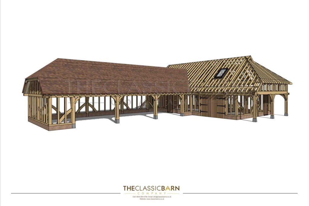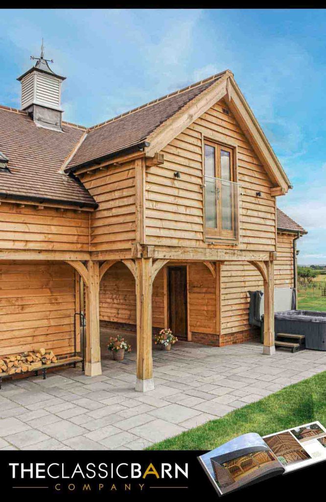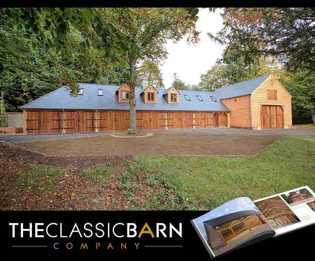 This example below was taken from a turn key project where the brief was to develop an outbuilding complex with extra wide carports featuring large overhead oak trusses, that doubled up as an outdoor entertainment area. Upstairs in the L-shaped section is a well-appointed accommodation providing guests with some privacy. The Classic Barn Company provided a full turn key service that included fitting out the interior accommodation above, it is well worth contacting them to see this beautiful space.
